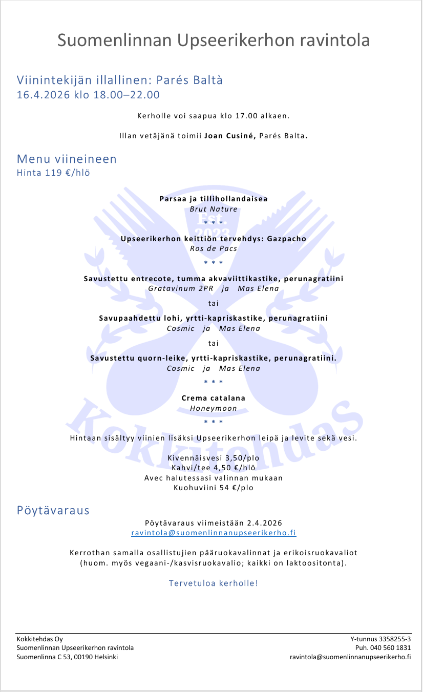 Suomenlinnan Upseerikerhon ravintolassa viinintekijän illallinen: Pares Balta